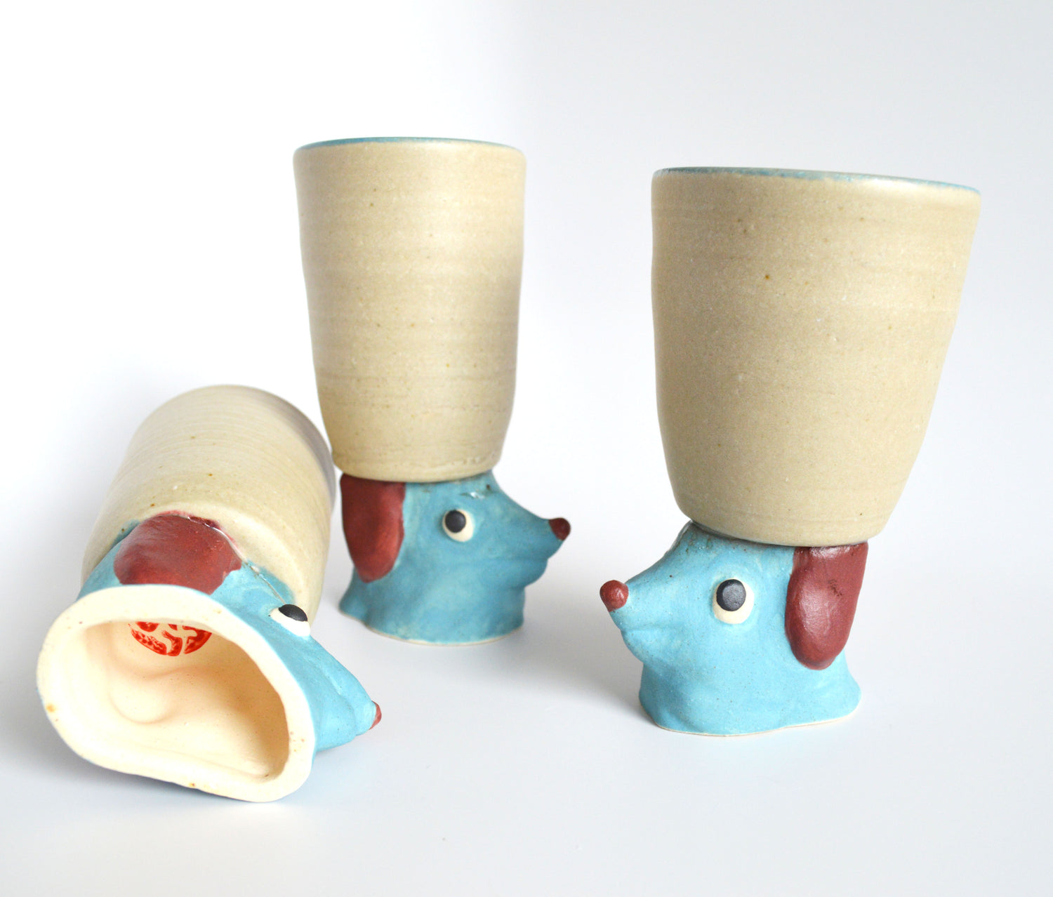 Just like the new pink dogs, but blue! These came out a little splotchy/painterly and have some spots of glaze on the blue.