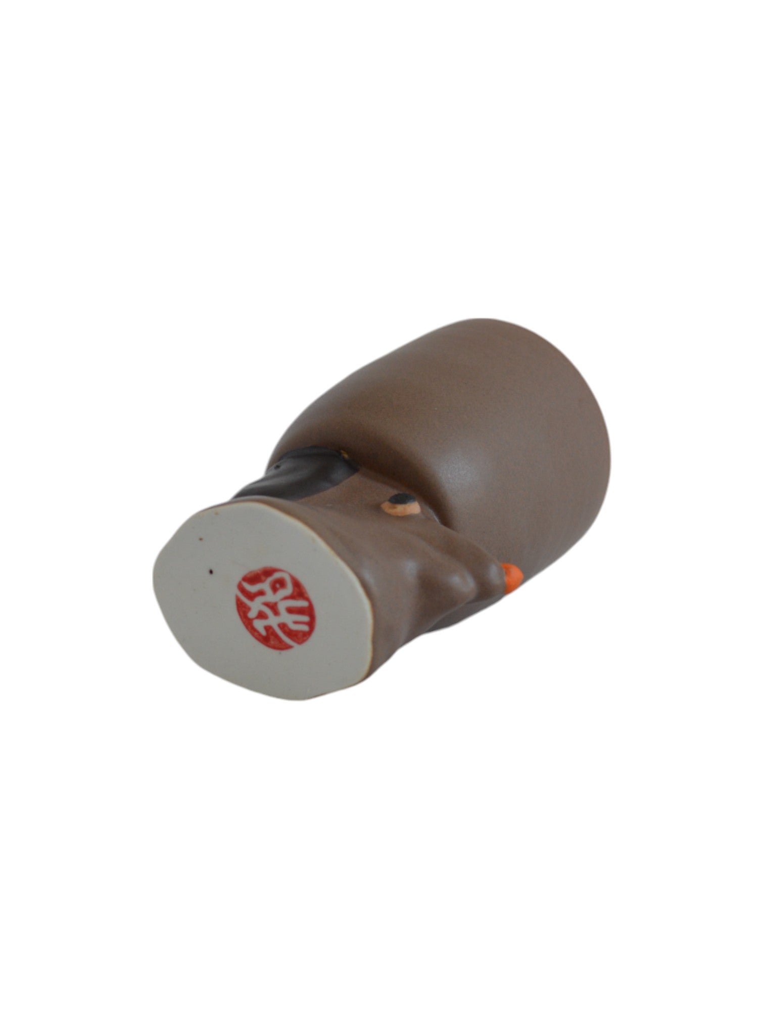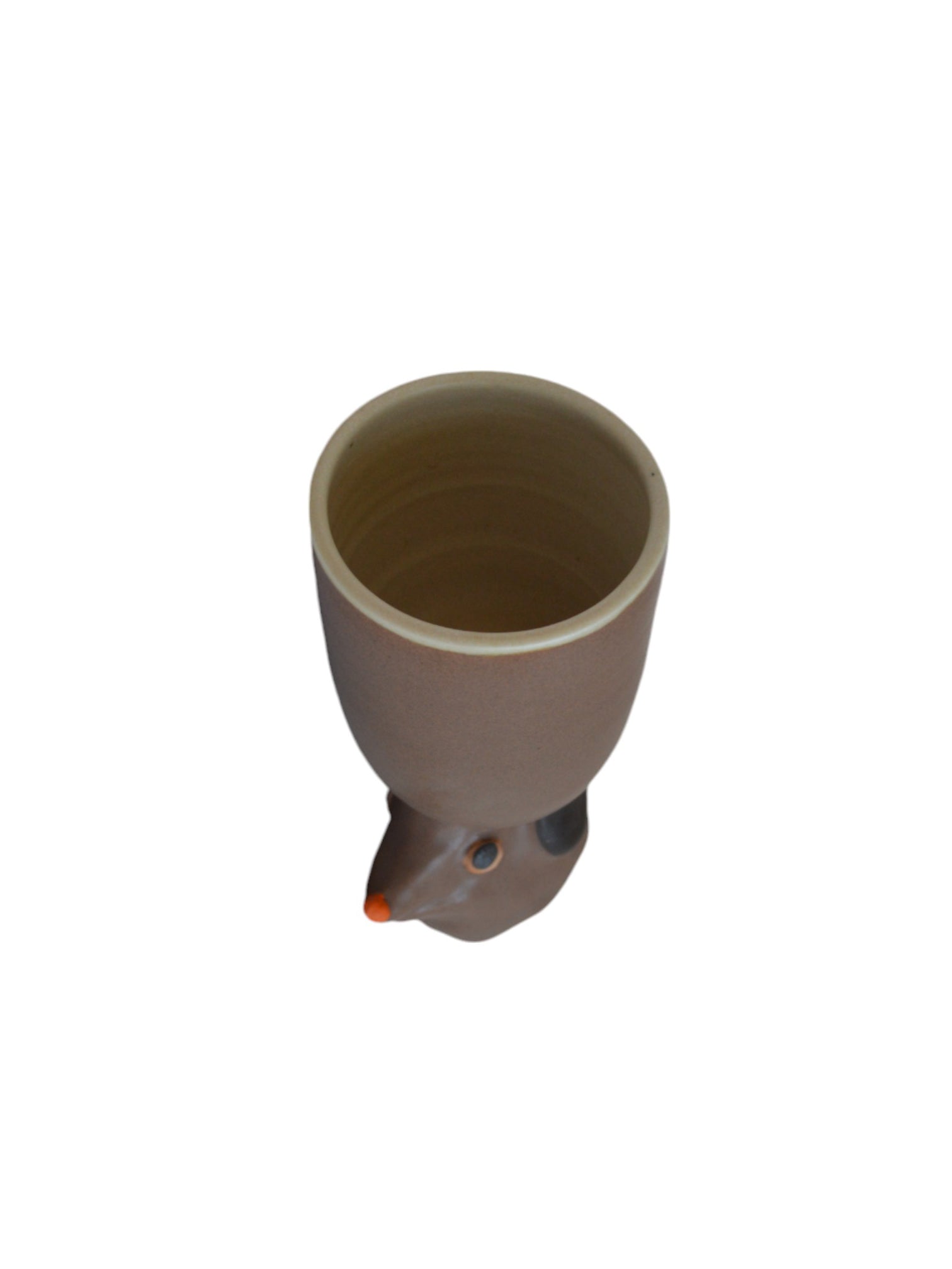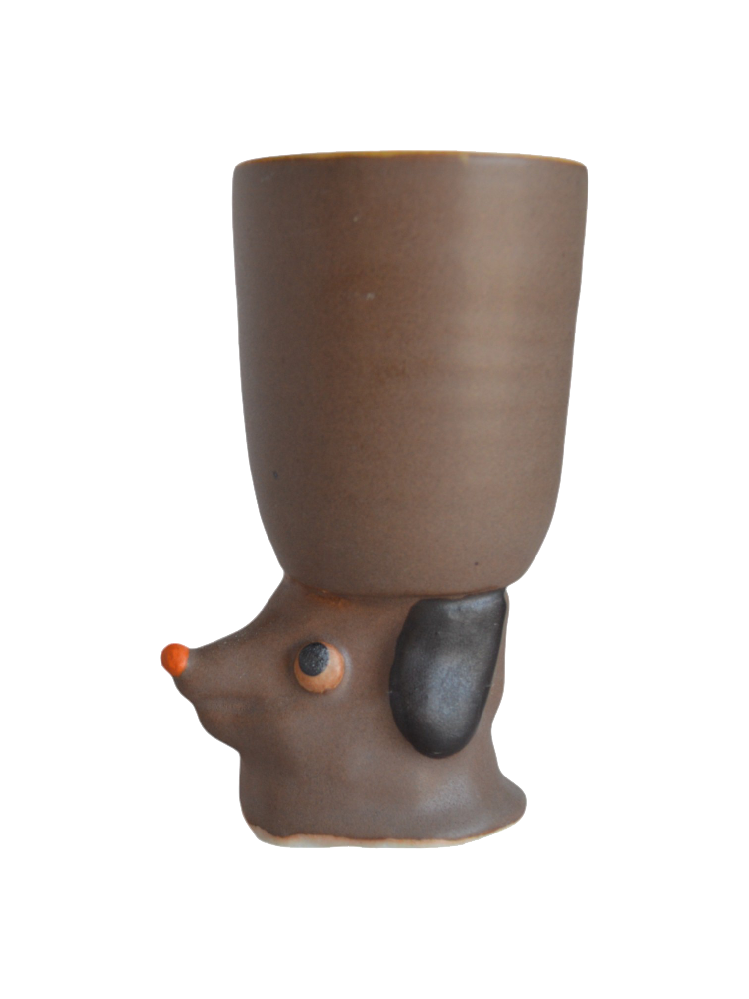 This little doggy cup/vase is here to be a spot of fun in your day. He's one of those dogs with a little bit of weird energy, but has a great heart. He likes other dogs, but it's unclear if they like him back. He'll be a great addition to your home as a daily cup or a vase to hold a bouquet of flowers from your garden. Comes in two colors, this one is a walnut brown with a satin finish.
