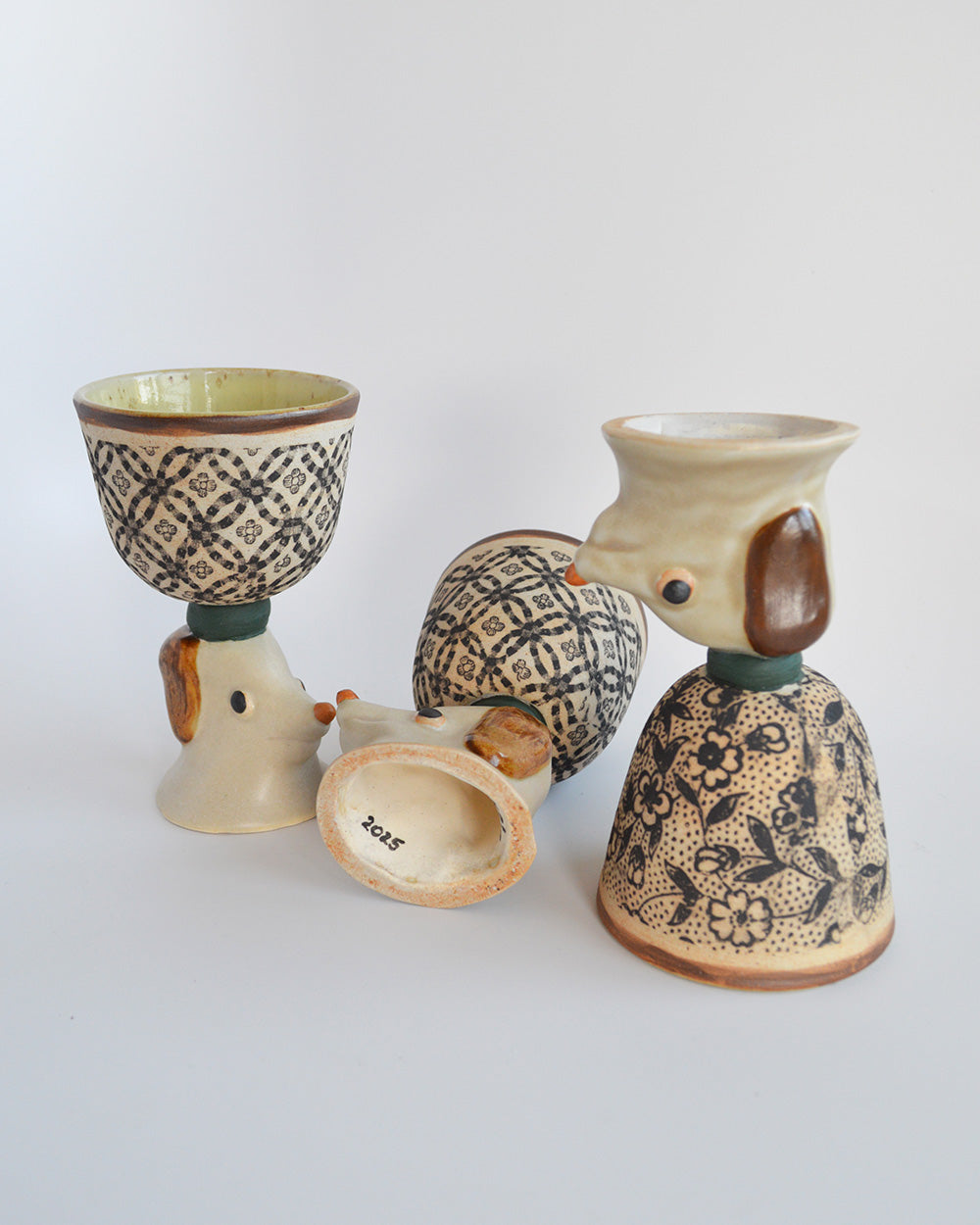 This little doggy cup is here to be a spot of fun in your day. He's one of those dogs with a little bit of weird energy, but has a great heart. He likes other dogs, but it's unclear if they like him back. He'll be a great addition to your home as a special cup to hold a sparkly beverage. The bottom portion of the dog is glazed with a soft satin moon color and an orange nose. There's a middle green dot, and the top cup part is decorated with a black and white floral and geometric pattern. Inside has a kiwi-colored glossy finish.