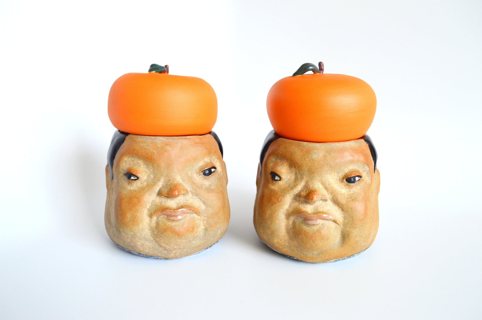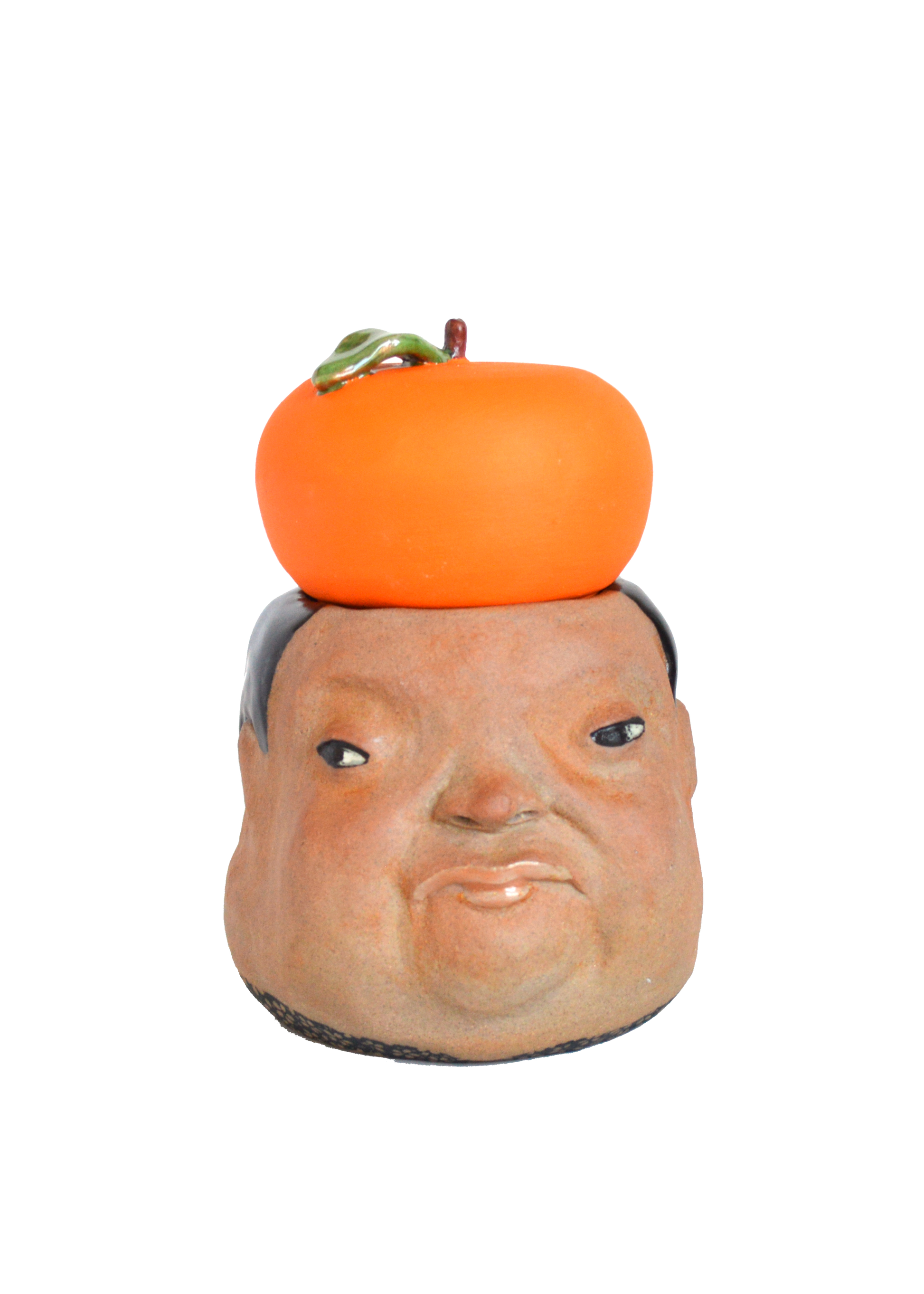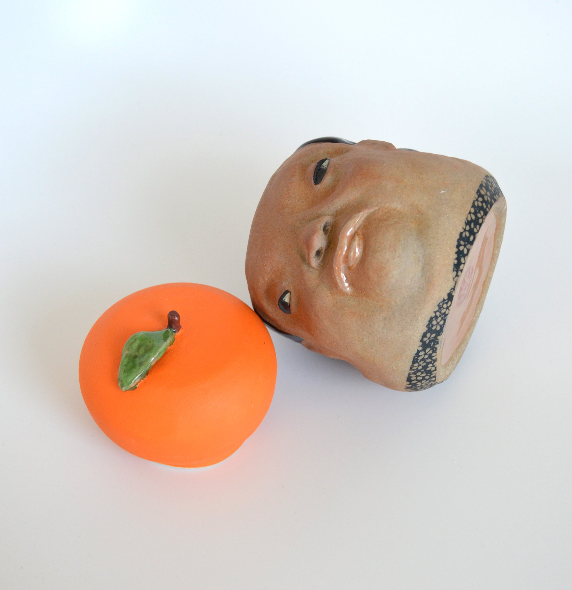 This sculpture is made from a mold of a Hana Ward sculpture. After the mold is cast Hana has (painstakingly) smoothed, formed, and finished off the sculpture with added embellishments. The sculpture has hand-painted features a little flower pattern on her collar. The lid of the vessel is a tangerine with sculpted leaf and stem.